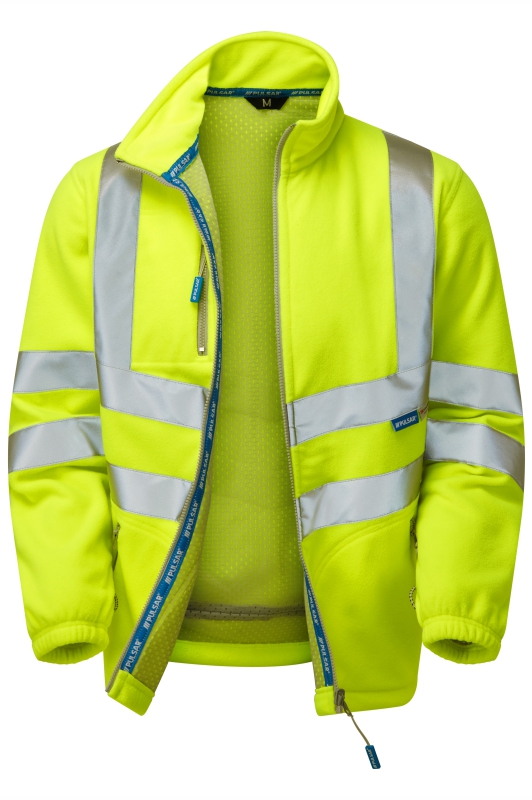 Stay warm, visible, and environmentally conscious with this soft, high-performance fleece jacket. Made from recycled 300gsm polyester polar fleece with a double anti-pill outer. Sewn-on reflective tape enhances visibility, while interactive features make it a compatible garment with the PULSAR PROTECT Storm Coat for all-weather versatility. Cosy, heavyweight 300gsm recycled polyester polar fleece with anti-pill finish Sewn-on, solid reflective tape YKK interactive, centre front fastening Interactive attachment points at cuff and centre back neck Interactive with PULSAR PROTECT Storm Coat One zipped pocket at chest Two zip side pockets Light grey mesh lining PULSAR branded zip pulls